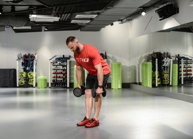 1) Mantenendo la posizione corretta del corpo, inspirare e iniziare a inclinare il busto in avanti, mediante lo spostamento dei fianchi all'indietro.