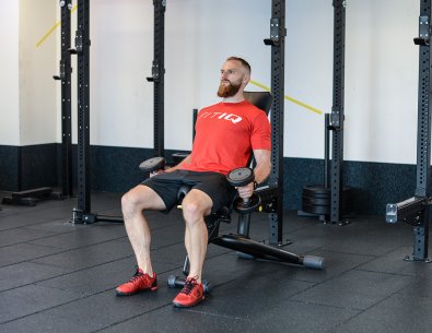 2) Mantenere la massima contrazione del bicipite per una frazione di secondo, nel punto più alto del movimento (isometria). Successivamente, con un movimento lento, abbassare i manubri eseguendo un movimento continuo.