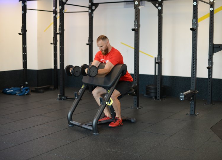 1) Seduti su panca Scott, gomiti appoggiati e schiena dritta.