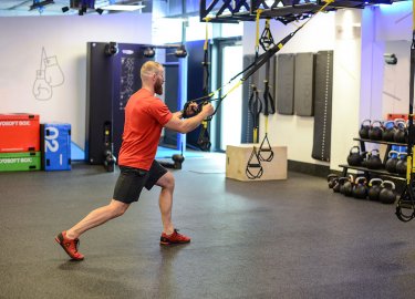 1) Mantenendo la postura corretta, eseguire un passo all'indietro con una gamba. La gamba anteriore resterà ferma, con tutta la pianta del piede appoggiata sul pavimento. Le braccia distese tengono le cinghie.